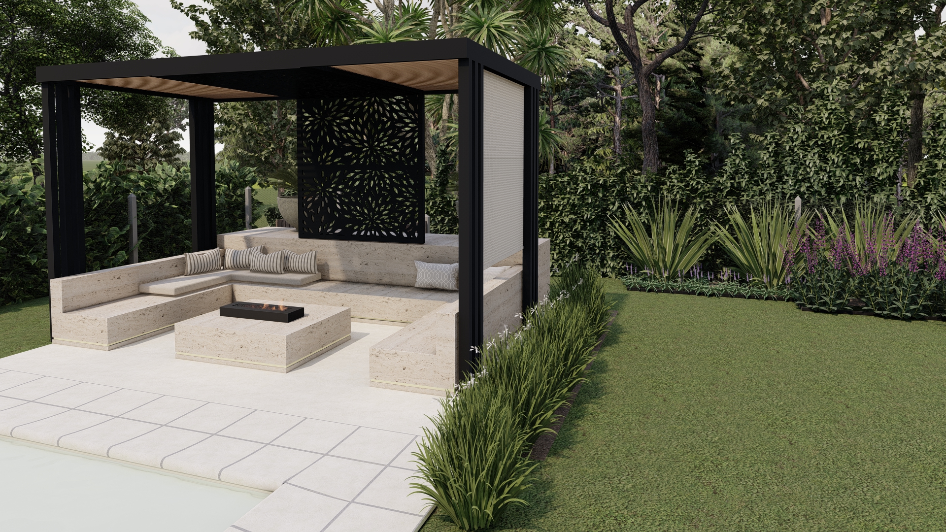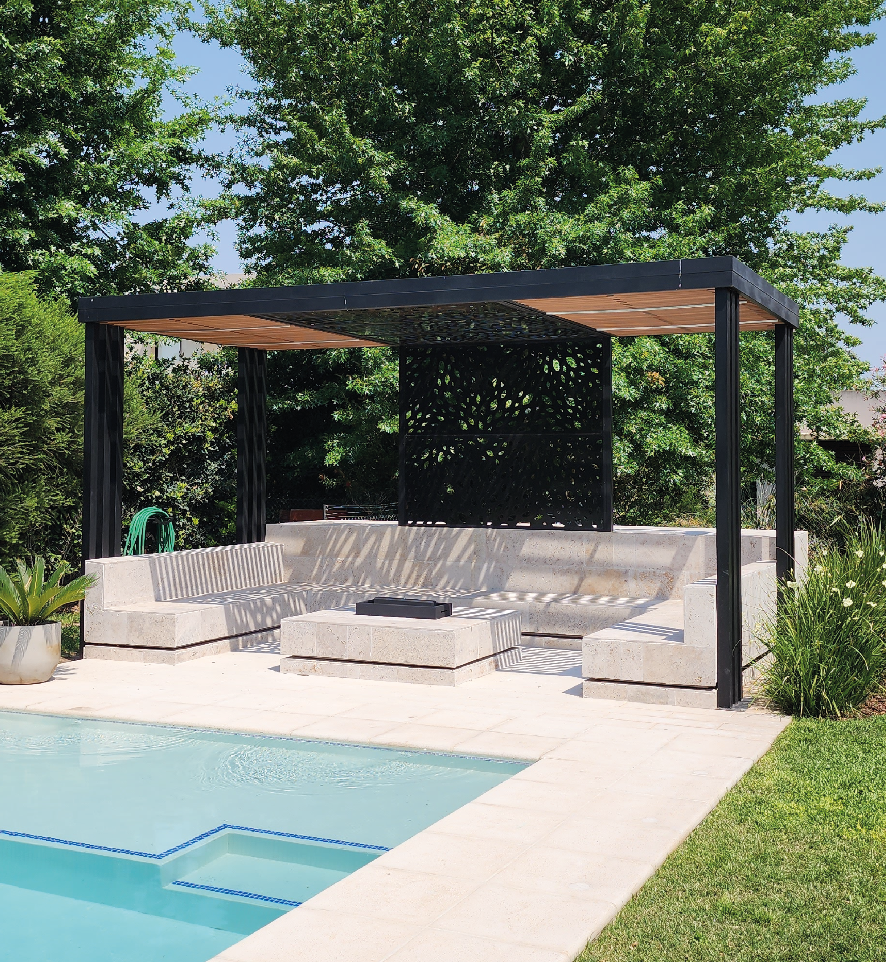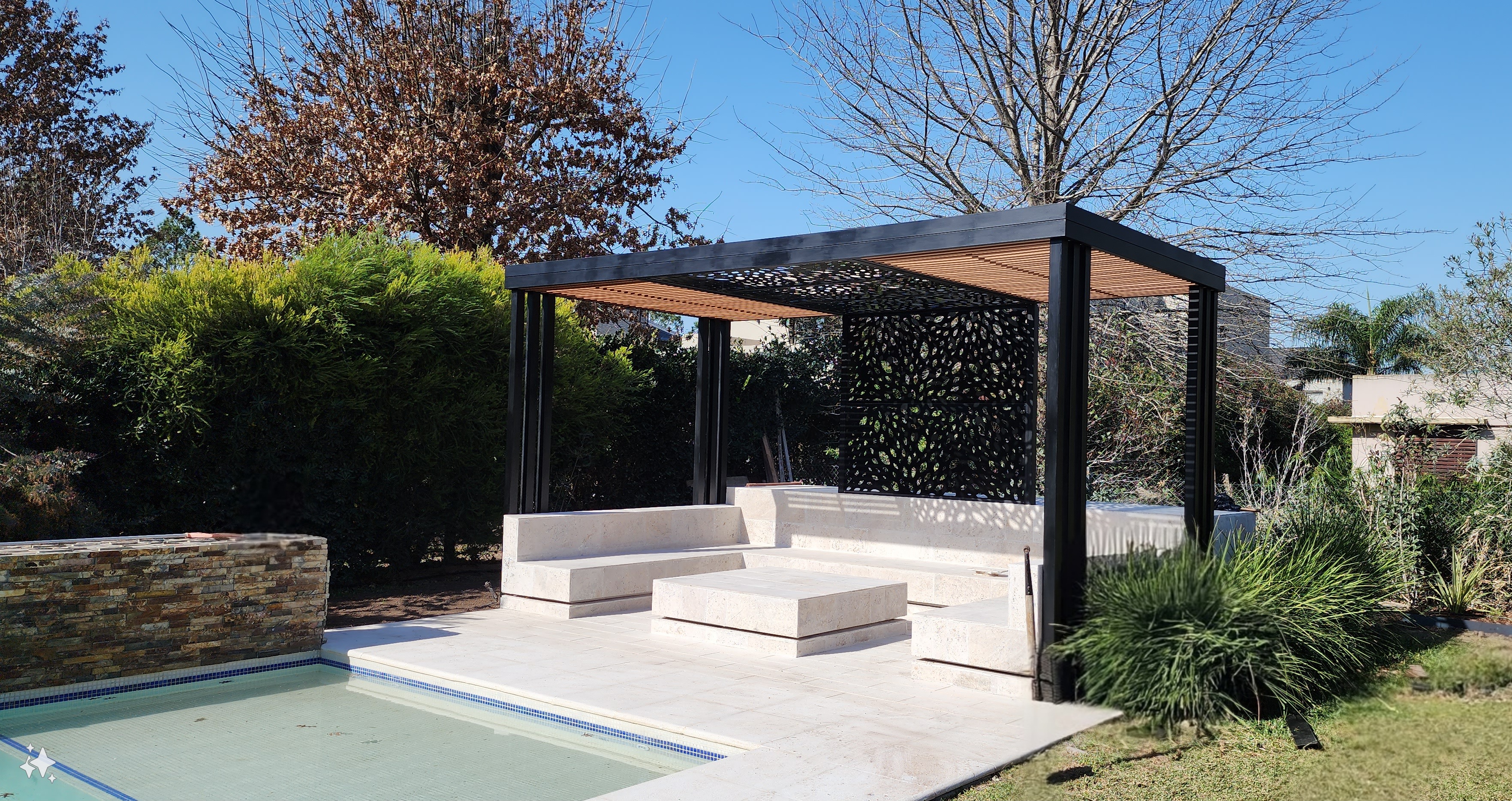 Nuestra propuesta fue una remodelación completa, creamos un área junto a la piscina, diseñando una exclusiva pérgola para brindar sombra y disfrutar del espacio durante todo el día y un fogón para las noches, recubrimos todo el sector con mármol travertino. Diseñamos además una zona de descanso con un gran camastro, así como un espacio con mesa y sillas.