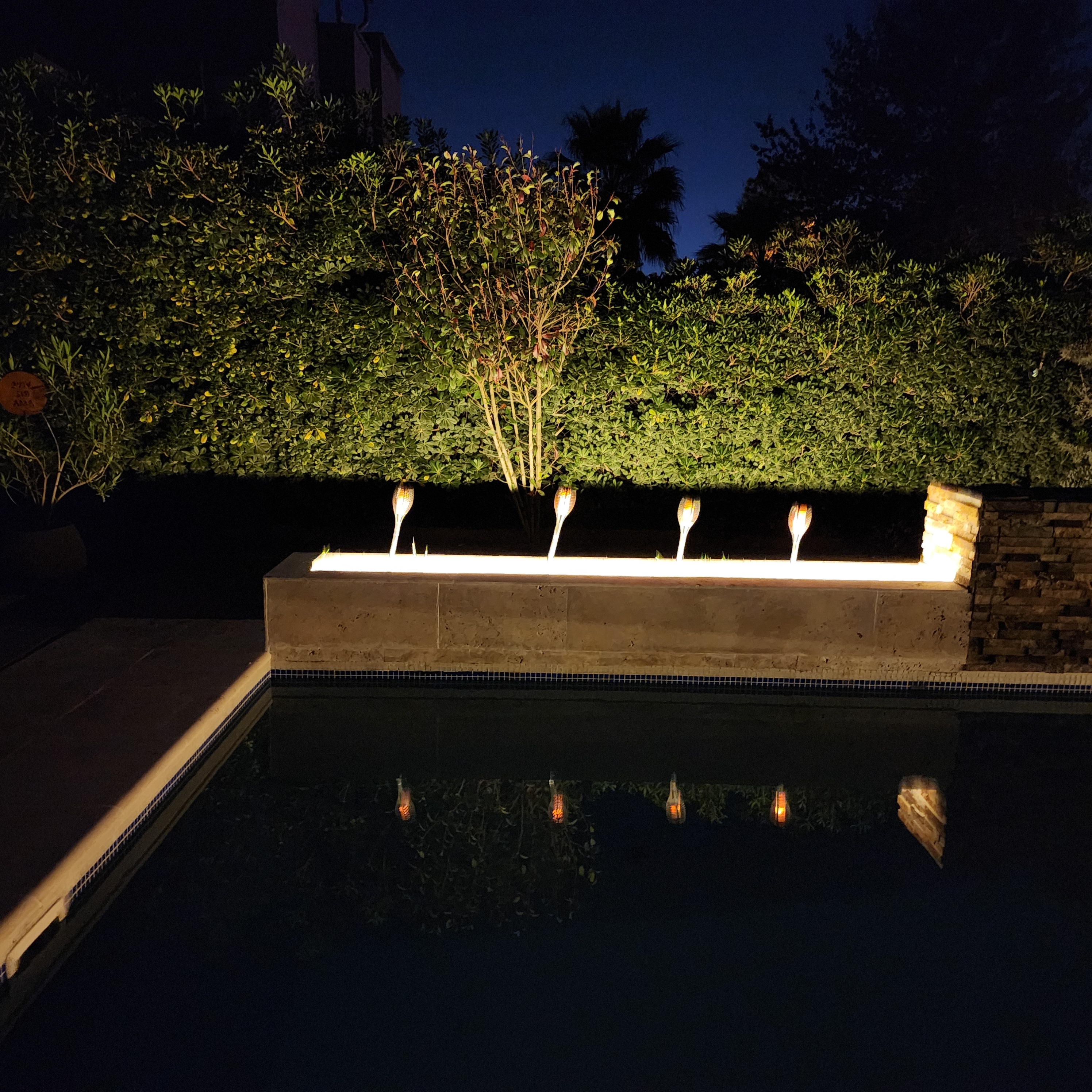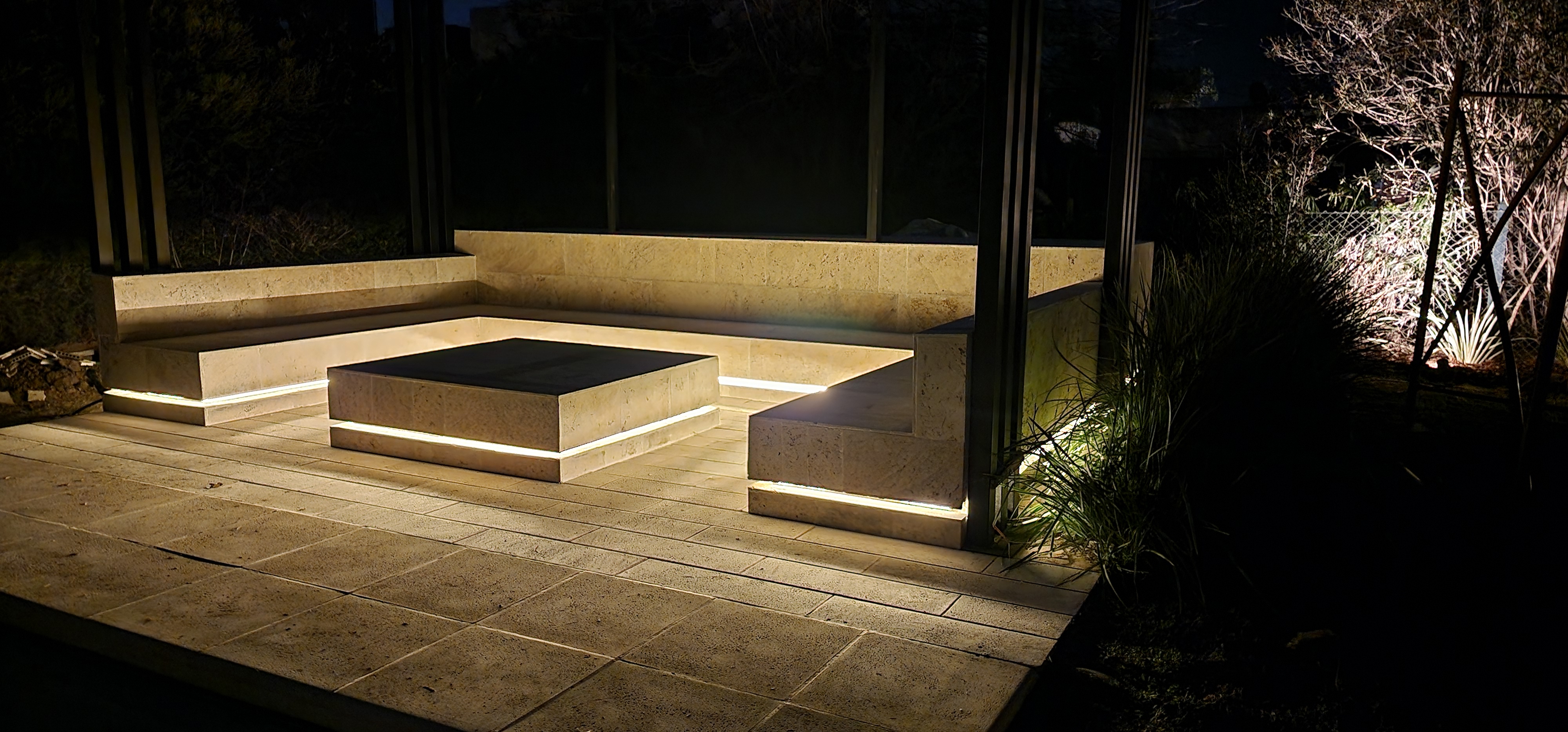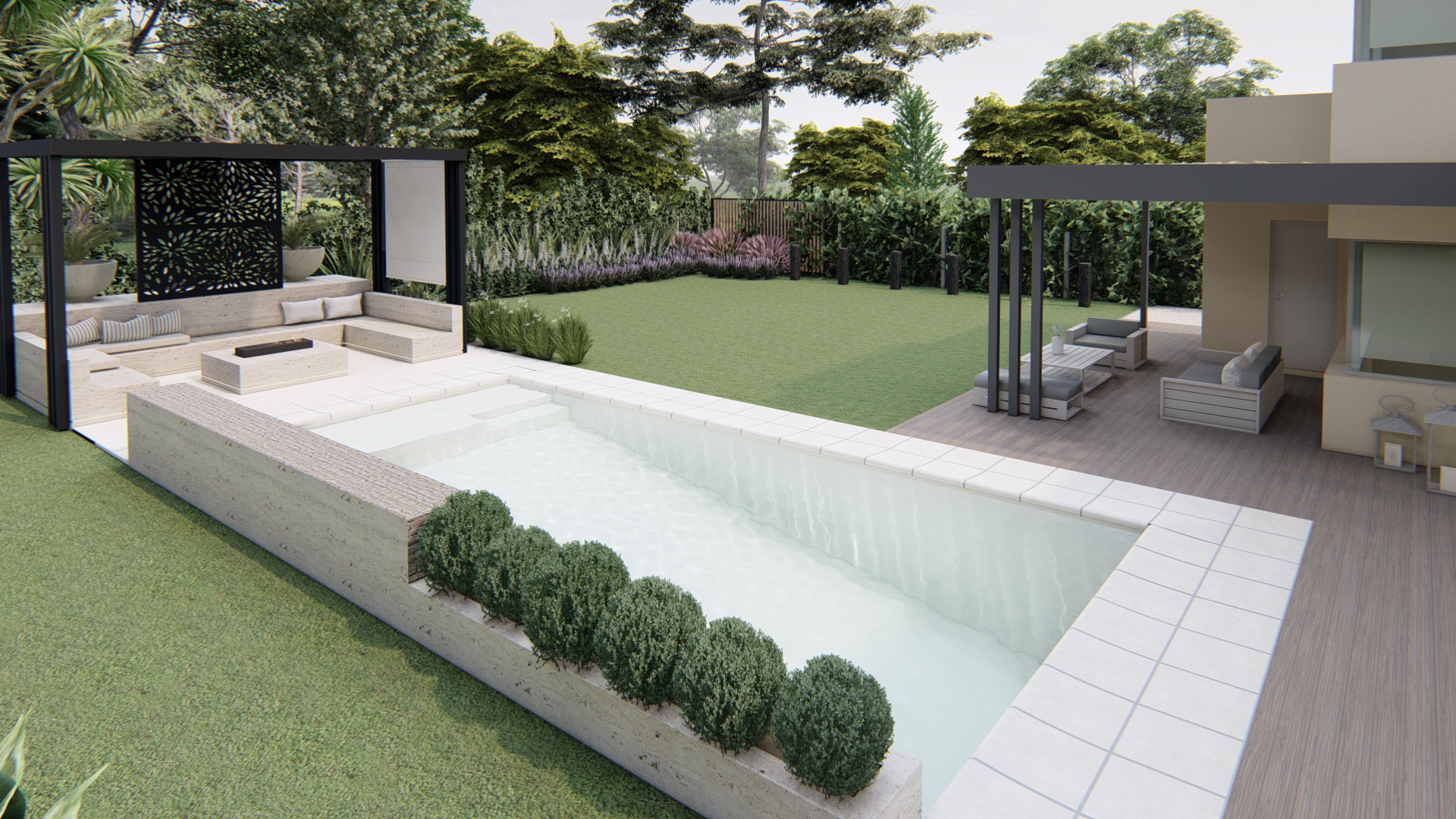 Nuestra propuesta fue una remodelación completa, creamos un área junto a la piscina, diseñando una exclusiva pérgola para brindar sombra y disfrutar del espacio durante todo el día y un fogón para las noches, recubrimos todo el sector con mármol travertino. Diseñamos además una zona de descanso con un gran camastro, así como un espacio con mesa y sillas.