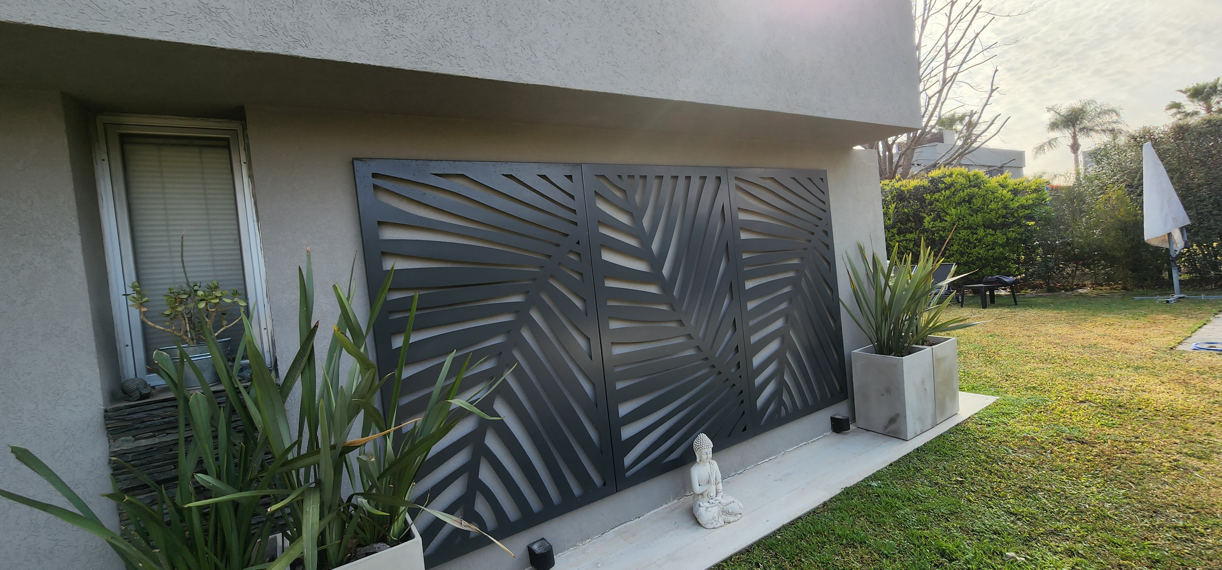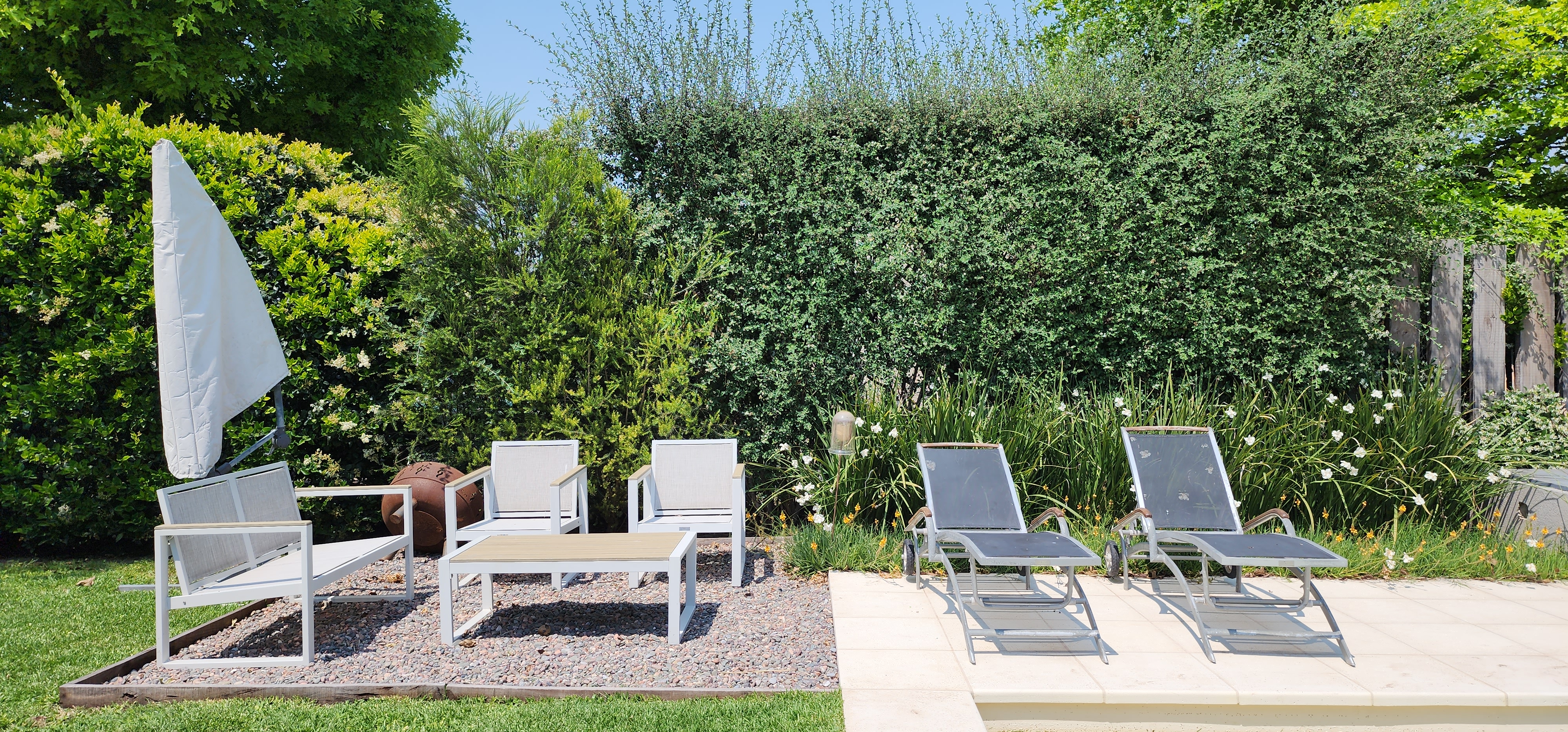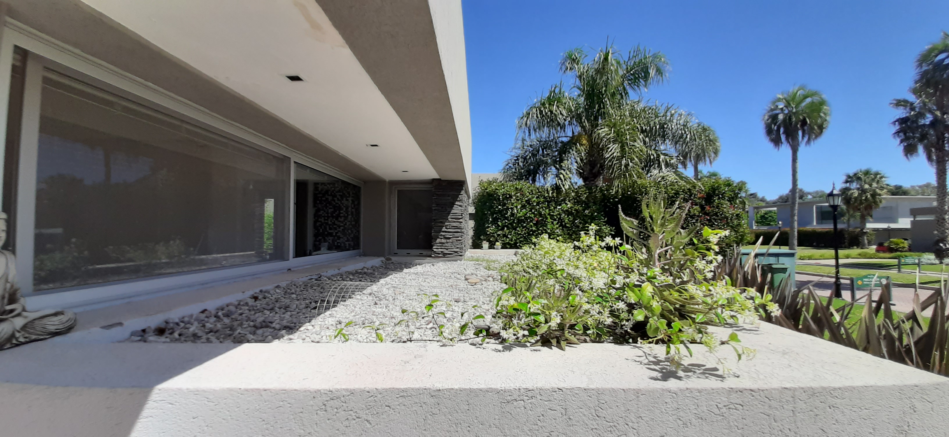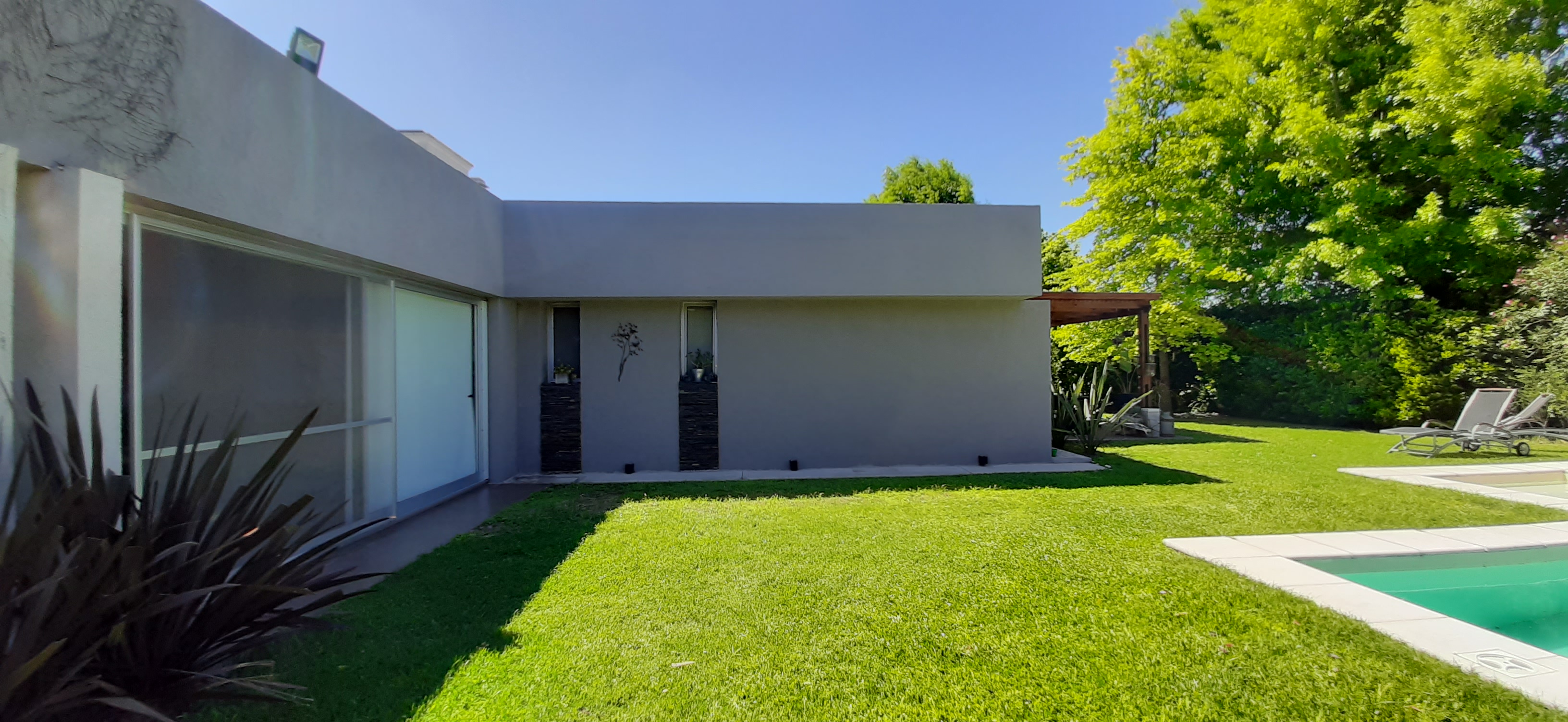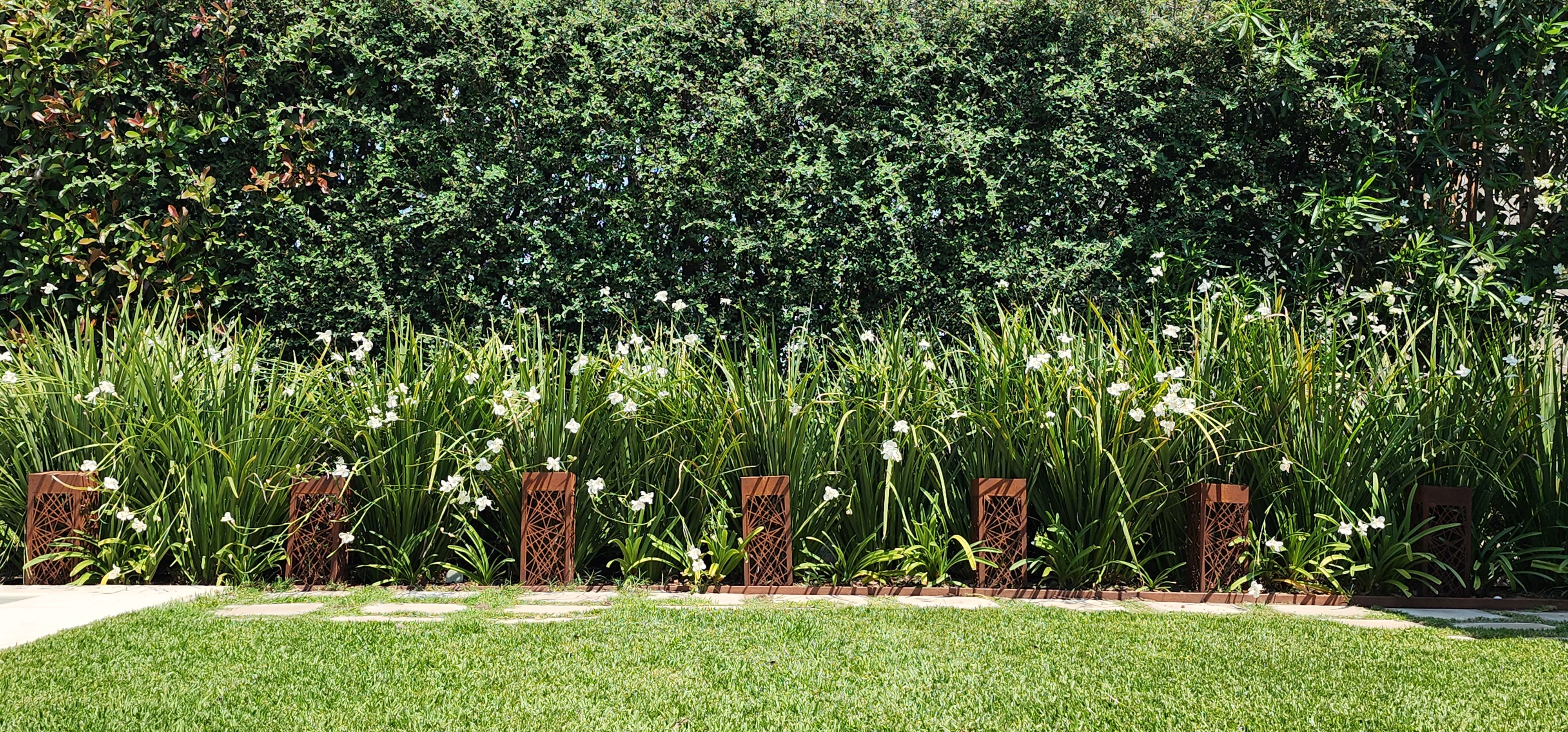 En este proyecto realizamos una lomada con plantas tropicales de hojas grandes, que además de proporcionar sombra, daban mayor intimidad. Tapamos la bomba de la piscina con quebracho, armando por delante canteros que lograron una integración natural hermosa. Modificamos el camino de la pileta con losetas cuadradas y en el lateral derecho un cantero con luminarias de diseño. En el frente sumamos plantas a los Phormios ya existentes y colocamos delimitadores de acero. Reformamos la zona de huerta, la armamos elevada, de quebracho y con dos niveles. Al finalizar el proyecto, nuestra clienta, feliz por el resultado, nos encargó una zona de fogón que se logró con éxito.