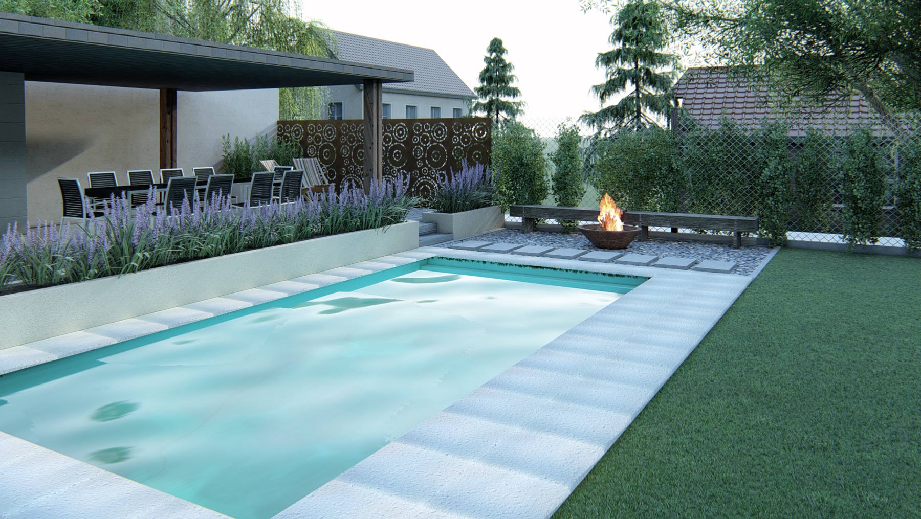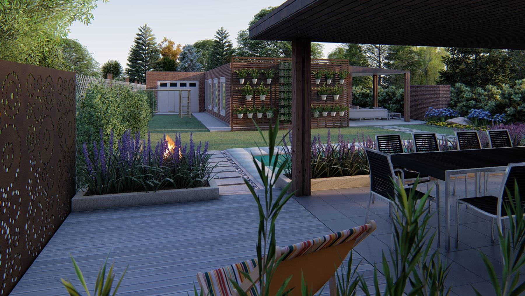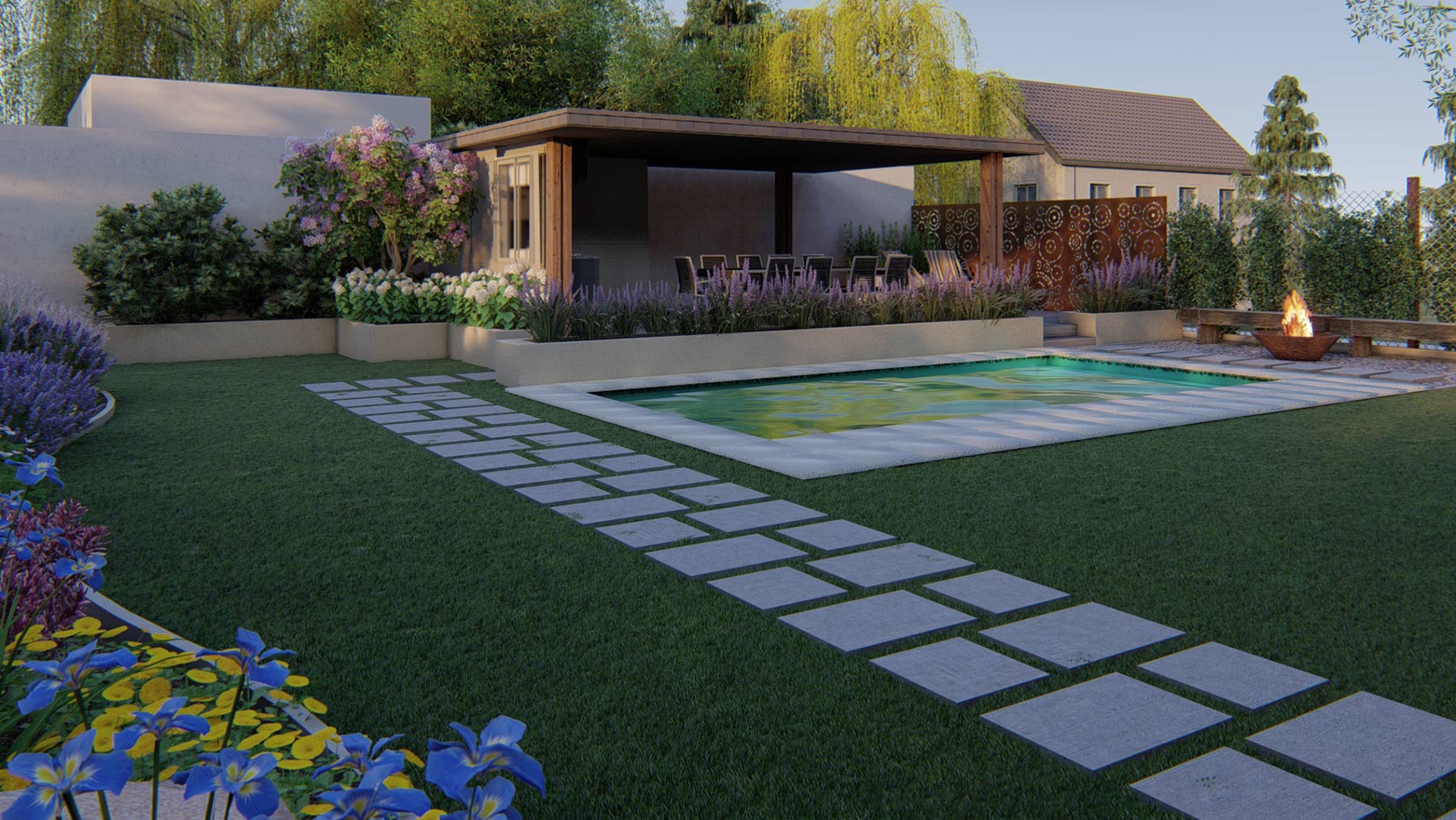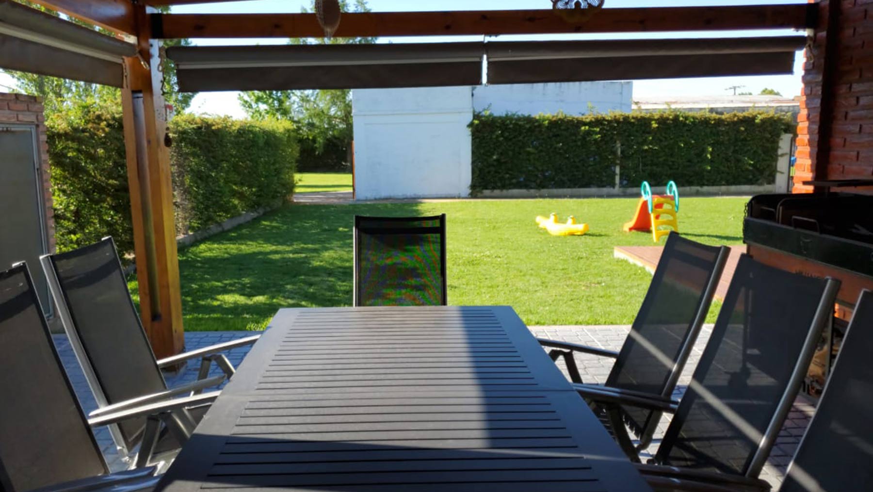 La premisa de este proyecto fue, queremos un quincho abierto, elevado con baño que a su vez sirva como separador de ambientes ya que comparte pared con unas oficinas, una pileta y muchas flores. En plena obra, el ambiente se extendió un metro y medio más -ya se sabe que los proyectos están vivos-, y no faltó el drama: justo nos agarró la pandemia y paramos 3 meses. Pero lo bueno tarda en llegar, y finalmente terminamos la obra y además tuvo una sorpresa extra: hoy la cliente es una gran amiga.